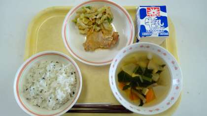 ・わかめごはん ・鶏肉の西京焼き ・ごま和え ・野菜汁 ・牛乳