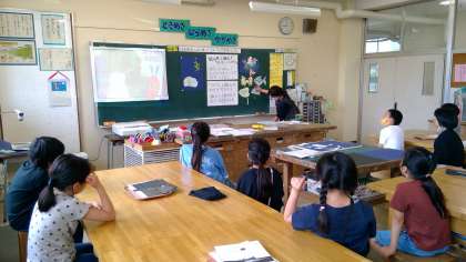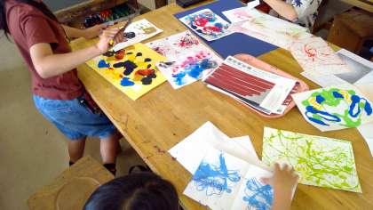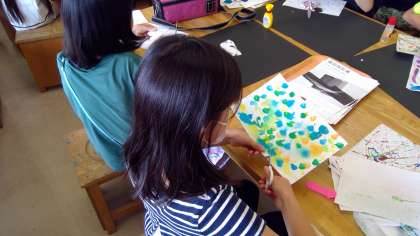 3年生は、これまで、ビー玉、歯ブラシと金網など、身の回りの様々な物を使って絵の具でいろいろな模様を描き、「自分いろがみ」をつくってきました。