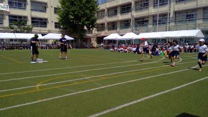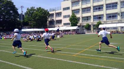 1年生にとっては、初めてのスポーツフェスティバル。最初の出場競技は、40m走です。自分のコースをまっすぐ走りきることを目指して練習してきました。満面の笑みで走っている姿が印象的です。