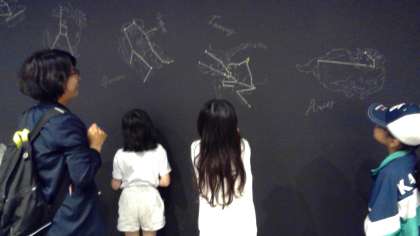 プラネタリウムでは、今日の渋谷の空の投影を観ました。太陽が沈み、街のあかりが消えると、たくさんの星が観えるようになり、子供たちから歓声があがりました。施設の方の問いかけに答えながら、星の学習をしました。