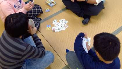 その後は、室内ゲームをしました。他の学級の人とも、けん玉、だるま落とし、トランプ、お絵描きなどをして一緒に楽しみました。