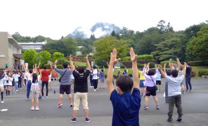 雨が上がったので、朝の集いを外で行うことができました。曇っていて、「さわやか」とまでは言えませんでしたが、いろいろな小鳥のさえずりが聞こえてきて、高原にきていることを実感しました。今朝も、いずみ学級の児童が、ラジオ体操の手本をしました。