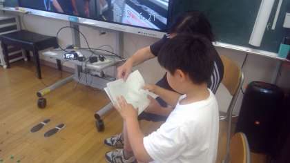 国語の時間に4・6年生が出かけた連合宿泊の動画を全員で観ました。4・6年生が作文を書いていたので、それを読みながら解説付きで動画を観ました。