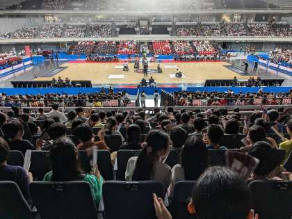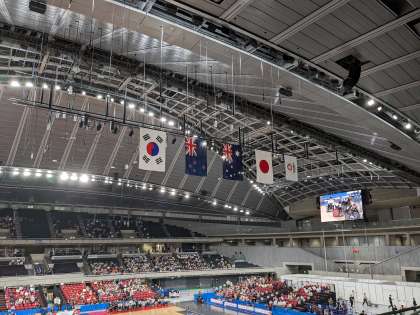 日本対ニュージーランドの試合でした。日本チームが得点を重ね、また、車いすがぶつかり合う場面もあり、体育館は大歓声に包まれていました。