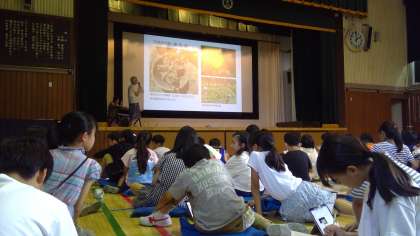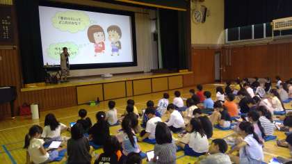 今日は「春の小川」について詳しいゲストティーチャーの方々をお招きし、体育館でお話を伺いました。川の昔と今の様子を見比べながら、自然の様子や未来に残していきたい思いなどについて教えていただきました。今回の貴重なお話を、まとめに生かしていきます。