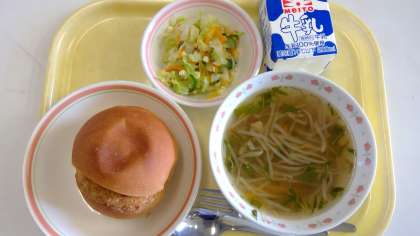 ・バウンズパン ・コロッケ ・チーズサラダ ・ジュリエンヌスープ ・牛乳