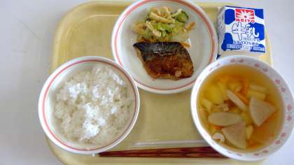 ・ごはん ・鯖の生姜風味焼き ・カリカリ個油揚げサラダ ・根菜汁 ・牛乳