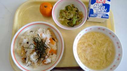 【七夕献立】 ・ちらし寿司 ・キャベツのおかか和え ・かきたま汁 ・冷凍みかん ・牛乳