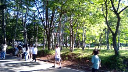 元気に最終日の朝を迎えることができました。外の空気がひんやりしていて、気持ちの良い朝です。湯ノ湖畔では、富谷小の他にも、たくさんの学校が朝会をしていました。