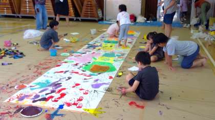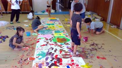 縦10mの長い紙に、集まったみんなで一斉に描き始めました。色をつけていくときには、刷毛だけでなく、手のひらや腕、足の裏も使って、楽しそうに描いていました。