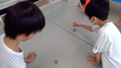 ビー玉を4個をくっつけると、長く回り続けるこまができました。私も初めて見るこまでした。子供たちも、作って、回してと、とても楽しんでいました。
