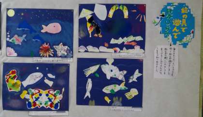 身の回りのいろいろなものを使って絵の具遊びをして仕上げた作品です。子供たちは、絵の具の新しい楽しさを見付けられたようです。