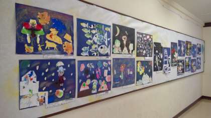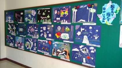廊下の掲示板に、3年生の「絵具で遊んで自分いろがみ」の作品が展示されています。