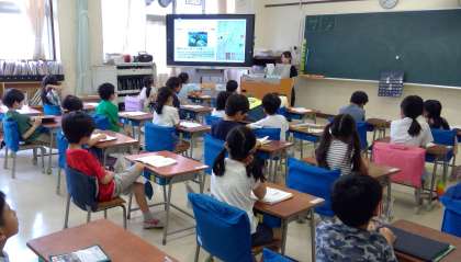 その課題に取り組んだ理由やきっかけ、調べたり制作したりして分かったことや感じたこと、全校のみんなへの呼びかけなどを、電子黒板の画面と放送とを使って発表しました。各教室では、放送を聞きながら感想をつぶやいたり拍手をしたりしながら、発表に見入っていました。