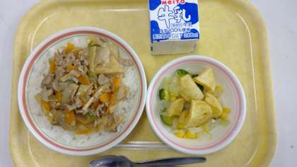 ・チンジャオロース丼 ・揚げ芋サラダ ・牛乳