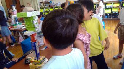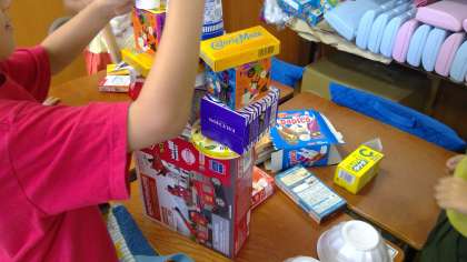 前期も終わりに近付いてきました。算数の学習は「かたち」の単元に入りました。実際に箱を積んだり、転がしたり、写し取ったりして、学習をすすめていきます。