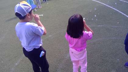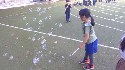天気がよいので前から計画していた1年生とのシャボン玉交流会を2時間目に実施しました。1〜4組の中にいずみ学級の児童もそれぞれ加わり、一緒にシャボン玉を吹いて飛ばし、楽しく交流活動をしました。