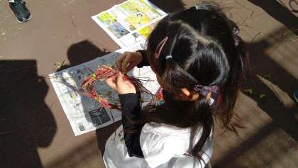 1年生は、夏の間たくさんの花を咲かせていたアサガオのつるを支柱から外していました。リースを作るそうです。