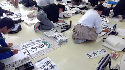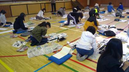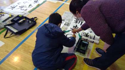 地域の書道の先生をお呼びし、毛筆の指導をしていただきました。書き初め用の大きな紙に書きました。一文字一文字の形や全体のバランス、筆使いなどに気を付けながら、丁寧に書いていました。