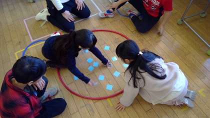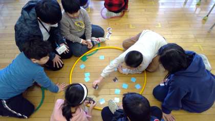 最後には、先生や友達の写真で作ったカードを使って「神経衰弱ゲーム」のようにかるた取りをしました。先生や友達の顔を意識してカードの位置を覚え、ゲームを楽しんでいました。