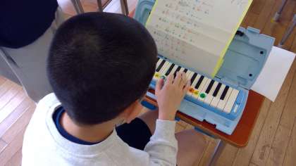 1月から音楽の時間に鍵盤ハーモニカの学習を始めました。楽曲は「軍隊行進曲」と「威風堂々」の2曲です。それぞれの曲は個人の進度に合わせて選び、音楽の先生に合わせて弾いたり、自分で繰り返し練習をしたりしています。5指で弾くことができるよう頑張る児童もいます。