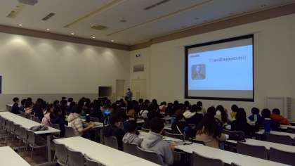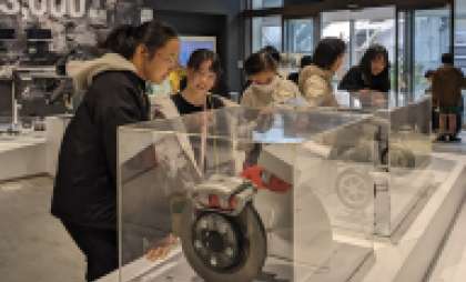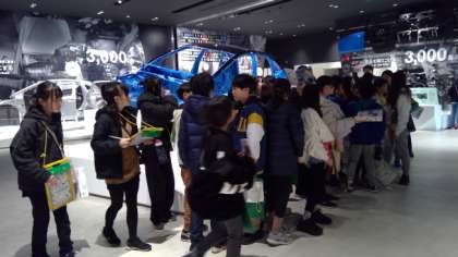 最初の見学地は、自動車工場でした。研修室で工場の概要を伺った後、自動車の仕組みの分かる展示物を見学したり、実際に自動車を組み立てているところを間近に見たりしました。