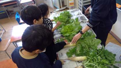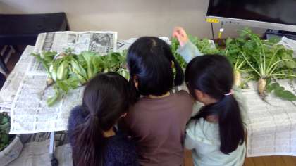 秋に種まきをした野菜が収穫の時期を迎えました。グループに分かれ、今まで水やりや雑草抜きなどの世話をした野菜を掘りました。ラディッシュ、カブはまあまあの出来具合でしたが、大根と白菜は太く大きく育ち、抜くたびに歓声があがるほどでした。