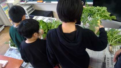 教室に戻り、再び野菜を観察する時間を設けました。白菜の中をのぞく児童や、太い大根を「お店で売っている野菜のようだ。」とうれしそうにかかげる児童などがいて、野菜の感触を意欲的に確かめていました。