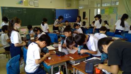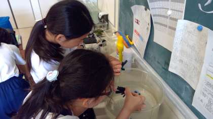 教室で育てているメダカがたくさんの卵を産みました。今日は、卵の様子を顕微鏡で観察していました。観ている最中に卵からかえったメダカもいて、感動の瞬間でした。