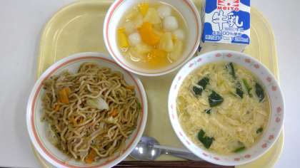 ・焼きそば ・かき玉スープ ・フルーツ白玉 ・牛乳