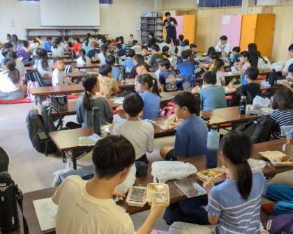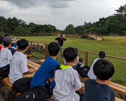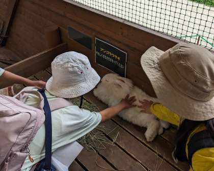 最初に、涼しい休憩所でお弁当を食べました。ここから班行動の始まりです。班ごとに「いただきます」をして、食べ終わった班から動物のいるところに出発しました。様々な動物を間近で見たり、ファームショーを見たり、ウサギに触れ合ったりして、楽しい時間を過ごしました。
