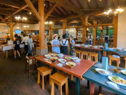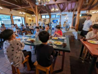 夕食準備の時間には、宿舎のスタッフの方々と一緒に食事係が活動しました。お皿の並べ方を確認した後、それぞれのテーブルに運びました。