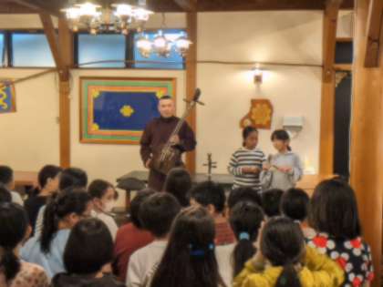 雨降りのため、夕食後のキャンプファイヤーを明日に延期し、馬頭琴の鑑賞会を行いました。