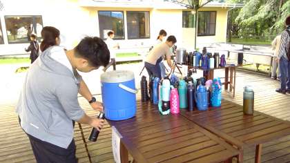 登山に備えて、先生たちが、水筒に麦茶を入れています。