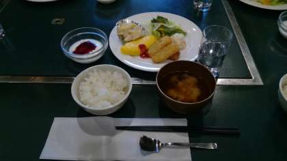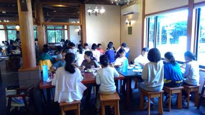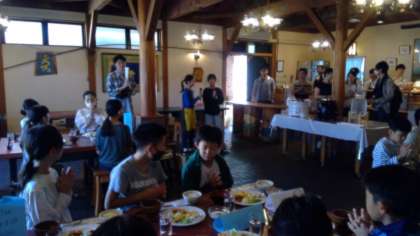 食事係の声かけで、みんなでそろって「いただきます!」 朝食をしっかりととって、登山に備えます。