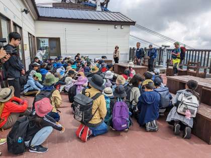 まず、ロープウェイで山頂駅(9合目)まで登りました。山頂駅で3名のガイドさんに挨拶をして、登山の心得を伺いました。