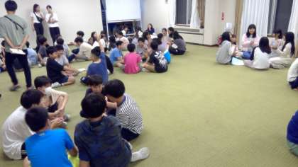 夕方から雨が降ってきたため、予定していたキャンプファイヤーを翌日に延期し、室内レクリエーションをしました。各部屋でカードゲームなどをした後、全員で集まりました。進行は、レク係が行いました。