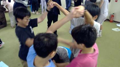その次に、「人間知恵の輪」をしました。やはり生活班ごとに行いました。つないだ手を離さないように手の間をくぐったり足を入れたりして、からまりをほどきました。あっという間にほどけたグループもあれば、苦戦しているグループもありました。