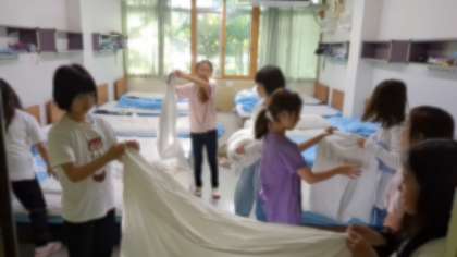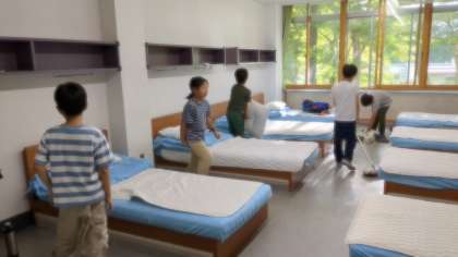 部屋の掃除は、自分たちでします。四隅をそろえて布団を畳むことに苦労していましたが、二人組になって、協力してしました。チェック表を確認しながら、退所点検を合格できるように頑張っていました。