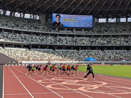 記録会が始まる前に記念イベントがあり、各校の代表児童が、100メートル走日本記録保持者である山縣亮太選手から、速く走るためのこつを教えていただきました。