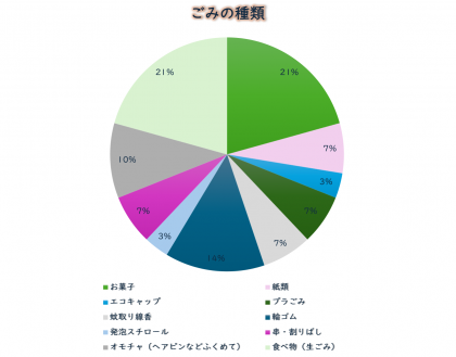 今回私たちは、「代々木八幡神社の例大祭が終わったころにゴミ拾いに行ったら、ゴミがたくさんあるのではないか」と考えました。そこで、例大祭の翌日にゴミ拾いに行ってきました。その時落ちていた主なごみの種類をグラフに表します。