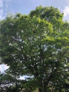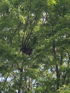 校庭門を入ったすぐ左に大きなけやきの木があります。その木に職員からカラスが巣を作っているとの知らせがあり、昨日業者の方に来てもらいました。用務主事さんと一緒に確認すると、ちょうど真ん中より上に小枝で作り途中の巣らしきものが見えます。業者の方によると、卵を産む前に撤去すると、また同じ場所に巣を作ることが多いとのことで、10日ほど様子を見ることになりました。また、巣を作っても必ずしも卵を産むとはかぎらないとのことです。学校としては児童及び保護者の方への安全が第一ですので、適切な対応を考えています。