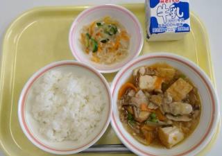 今日の献立は、ごはん・厚揚げのきのこあんかけ・じゃこ入り大根サラダ・牛乳です。『じゃこ』は、ごま油でカリカリに炒めてからサラダに混ぜています。ごま油の風味が加わり食べやすくなります。