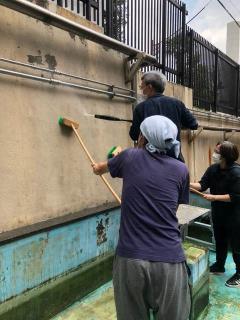 10月3日(土)・4日(日)の2日間で壁の塗装を行いました。作業はPTAの有志の方にご協力いただきました。3日はまず壁を高圧洗浄機を使って念入りに汚れを取ります。その後、下塗りを行いました。私も手伝させてもらいましたが、PTAの方々との語らいながらの作業は、コロナ対応で長く自粛が続いていたこともあり、私にとってとても楽しく有意義な時間でした。