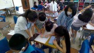 当番活動のポスター作りです。どんな風に仕上げようかな。友達と話し合いながら、進めています。