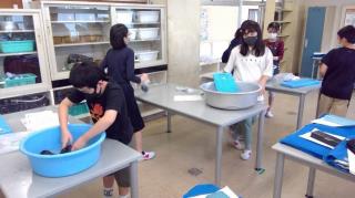 家庭科の学習で、靴下の洗濯を行いました。洗剤の量や洗い方を考えて取り組み、汚れを落とすことができました。