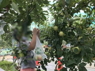 車とバスで世田谷区の高橋果樹園に行きリンゴ狩りをしました。リンゴのもぎ方を教えていただき、めあてのリンゴをの大きさや色を見ながらもいでいました。「とれた!」と子供たちは収穫したリンゴに満足げな様子でした。