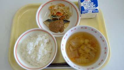 今日の献立は、ごはん・鯖のごまだれがけ・ちくわと野菜の和え物・吉野汁・牛乳です。『吉野汁』は澱粉でとろみをつけた汁ものです。今日は蒸し暑かったので、澱粉の量を減らしてとろみを緩く仕上げました。