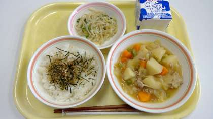 今日の献立は、ふりかけごはん・肉じゃがのカレー風味・きゅうりのしらす和え・牛乳です。今日の献立1番人気は『ふりかけごはん』、ふりかけを求めて行列ができていました。