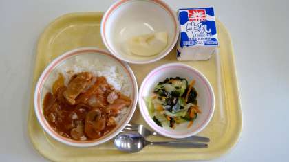 今日の献立は、ハヤシライス・わかめサラダ・りんご・牛乳です。給食は果物以外の生鮮食品に火を通しています。
